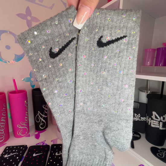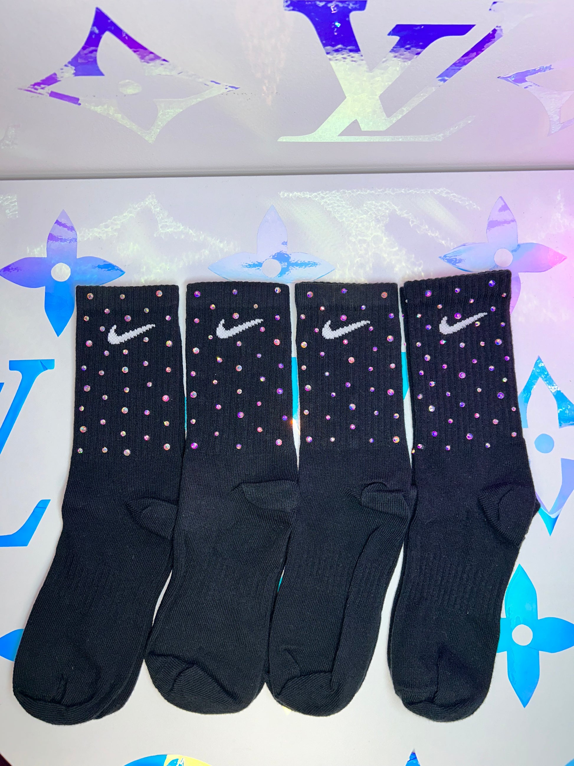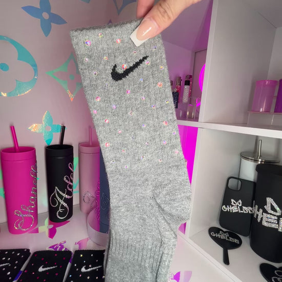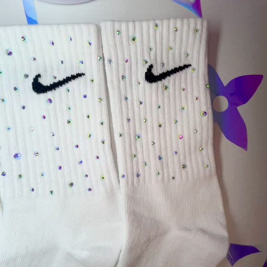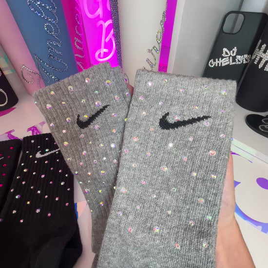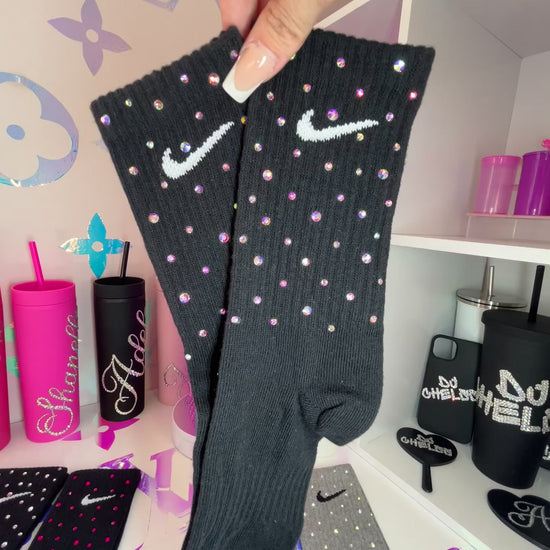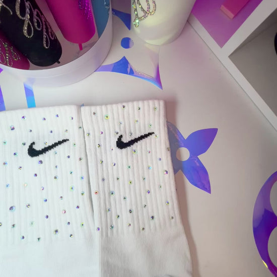 Add some sparkle to your step with these custom hand-embellished Nike crew socks. Using high-quality hotfix rhinestones, these socks are stand out and full of bling! Style them wearing your favourite trainers – these socks are a must-have for a BADDIE, sneakerhead and fashion lover ☆