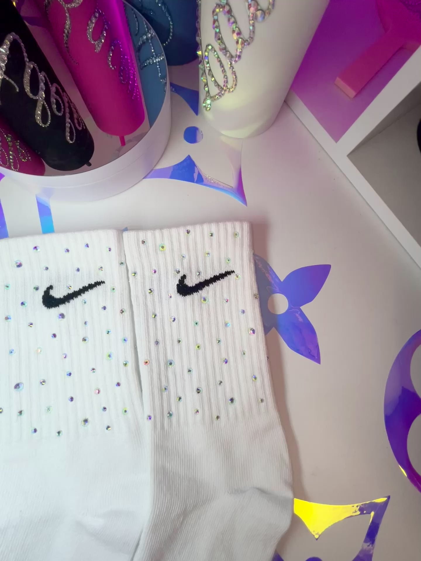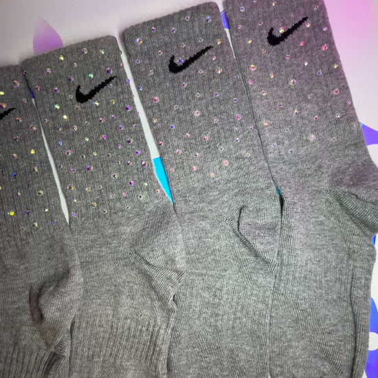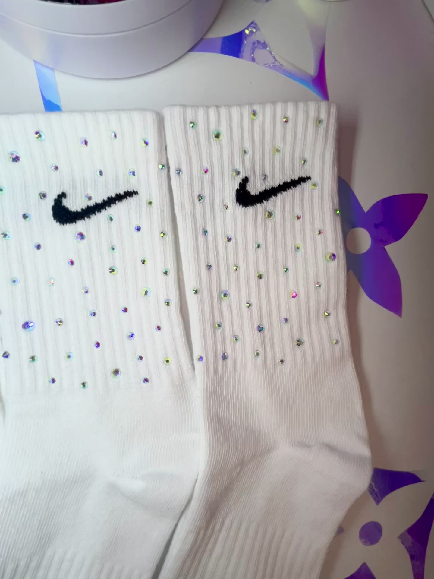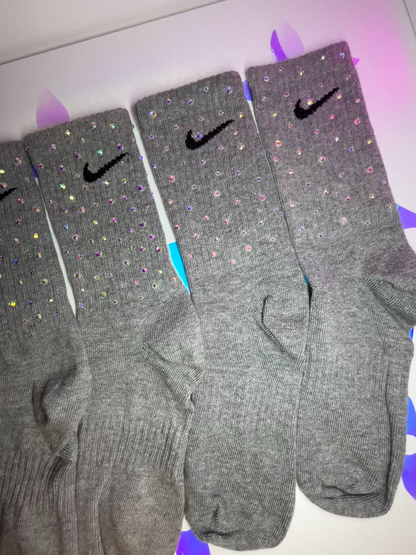 Add some sparkle to your step with these custom hand-embellished Nike crew socks. Using high-quality hotfix rhinestones, these socks are stand out and full of bling! Style them wearing your favourite trainers – these socks are a must-have for a BADDIE, sneakerhead and fashion lover ☆